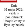 Dnia 02 maja 2022r. czyli w poniedziałek Urząd Gminy w Bytnicy będzie nieczynny.