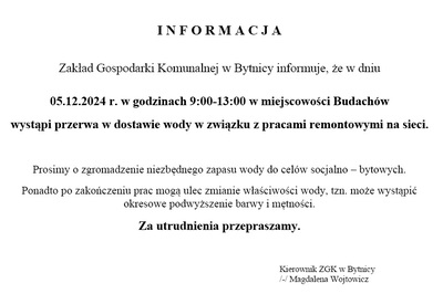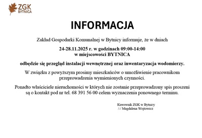 Uprzejmie informujemy, że w dniu 02 stycznia 2026r. (piątek) Urząd Gminy w Bytnicy będzie nieczynny. Za utrudnienia przepraszamy.