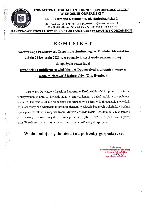 Komunikaty Państwowego Powiatowego Inspektora Sanitarnego w Krośnie Odrzańskim z dnia 23 kwietnia 2021 r. dot. jakości wody przeznaczonej do spożycia przez ludzi z wodociągu publicznego w Dobrosułowiu, zaopatrującego w wodę miejscowość Dobrosułów – woda nadaje się do picia i na potrzeby gospodarcze.