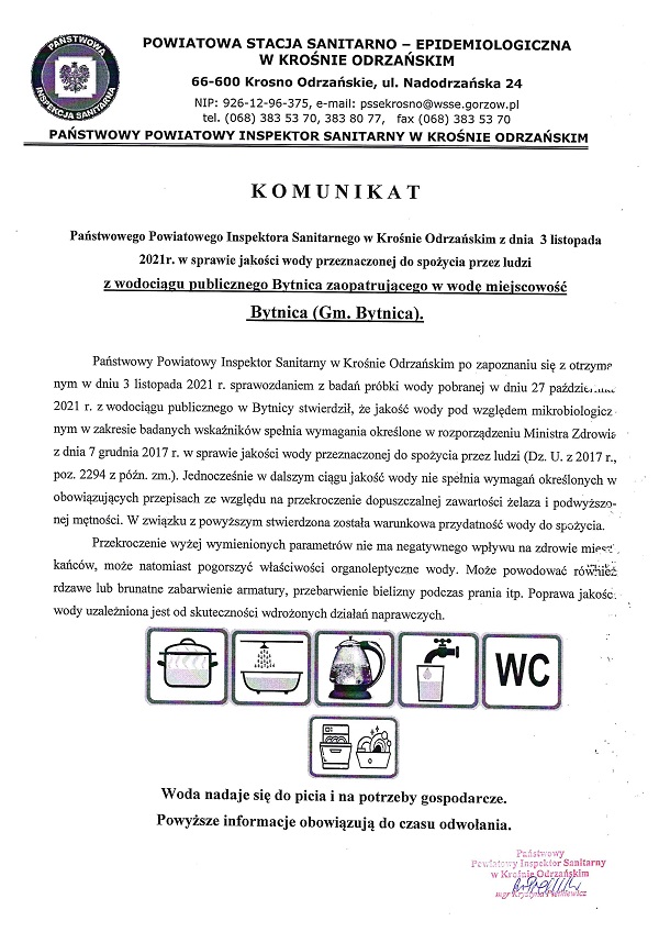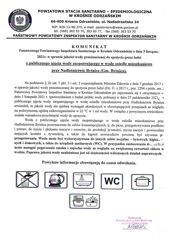 Komunikaty Państwowego Powiatowego Inspektora Sanitarnego w Krośnie Odrzańskim z dnia 3 listopada 2021 r. dot. jakości wody przeznaczonej do spożycia przez ludzi z publicznego ujęcia wody zaopatrującego w wodę: