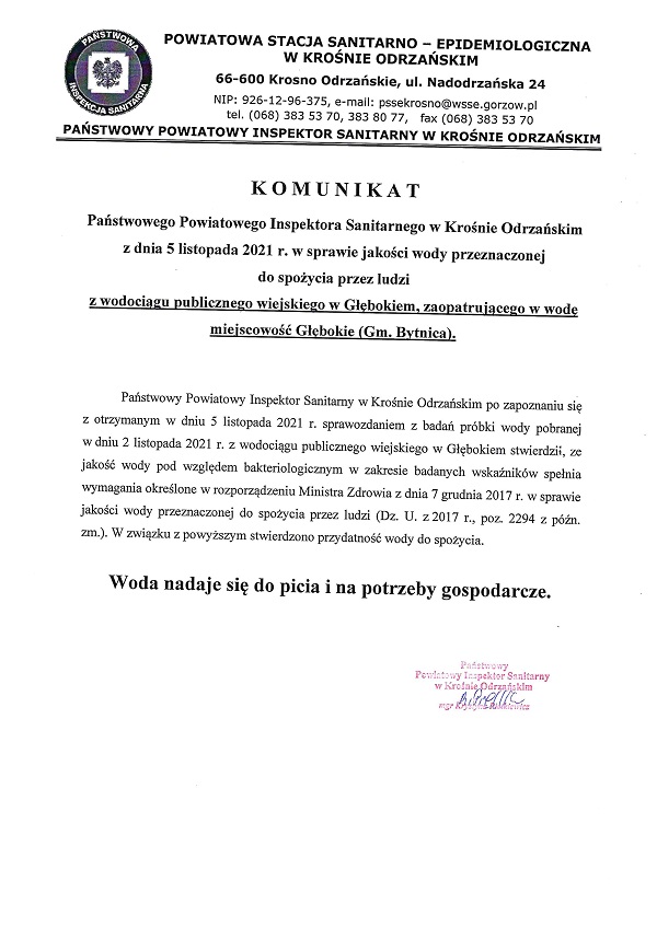 Komunikaty Państwowego Powiatowego Inspektora Sanitarnego w Krośnie Odrzańskim z dnia 05 listopada 2021 r. dot. jakości wody przeznaczonej do spożycia przez ludzi z wodociągu publicznego w Głębokiem, zaopatrującego w wodę miejscowość Głębokie – woda nadaje się do picia i na potrzeby gospodarcze.