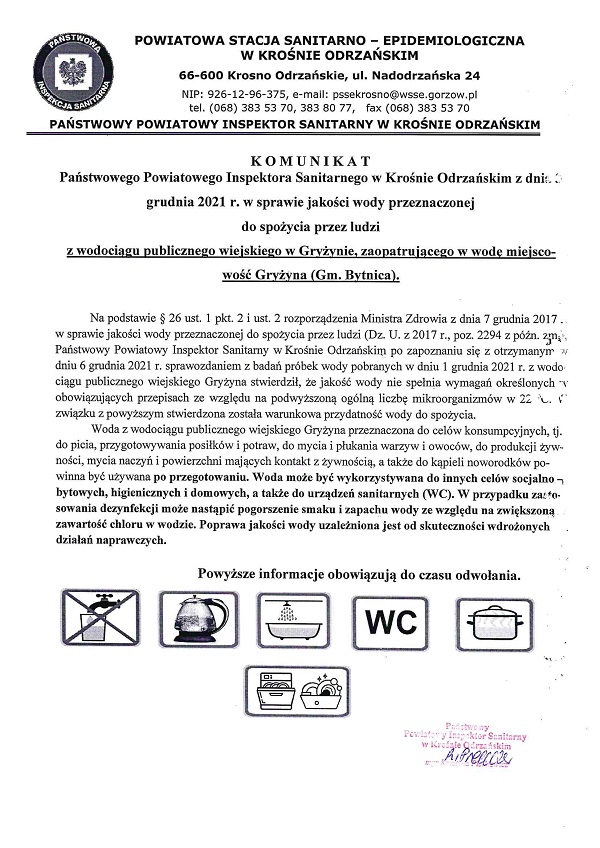 Komunikaty Państwowego Powiatowego Inspektora Sanitarnego w Krośnie Odrzańskim z dnia 6 grudnia 2021 r. dot. jakości wody przeznaczonej do spożycia przez ludzi z publicznego ujęcia wody zaopatrującego w wodę miejscowość Gryżyna – woda przeznaczona do celów konsumpcyjnych, tj. do picia, przygotowywania posiłków i potraw, do mycia i płukania warzyw i owoców, do produkcji żywności, mycia naczyń i powierzchni mających kontakt z żywnością, a także do kąpieli noworodków powinna być używana po przegotowaniu. Woda może być wykorzystywana do innych celów socjalno-bytowych, higienicznych i domowych, a także do urządzeń sanitarnych (wc). W przypadku zastosowania dezynfekcji może nastapić pogorszenie smaku i zapachu wody ze względu na zwiększoną zawartość chloru w wodzie. Poprawa jakości wody uzależniona jest od skuteczności wdrożonych działań naprawczych.