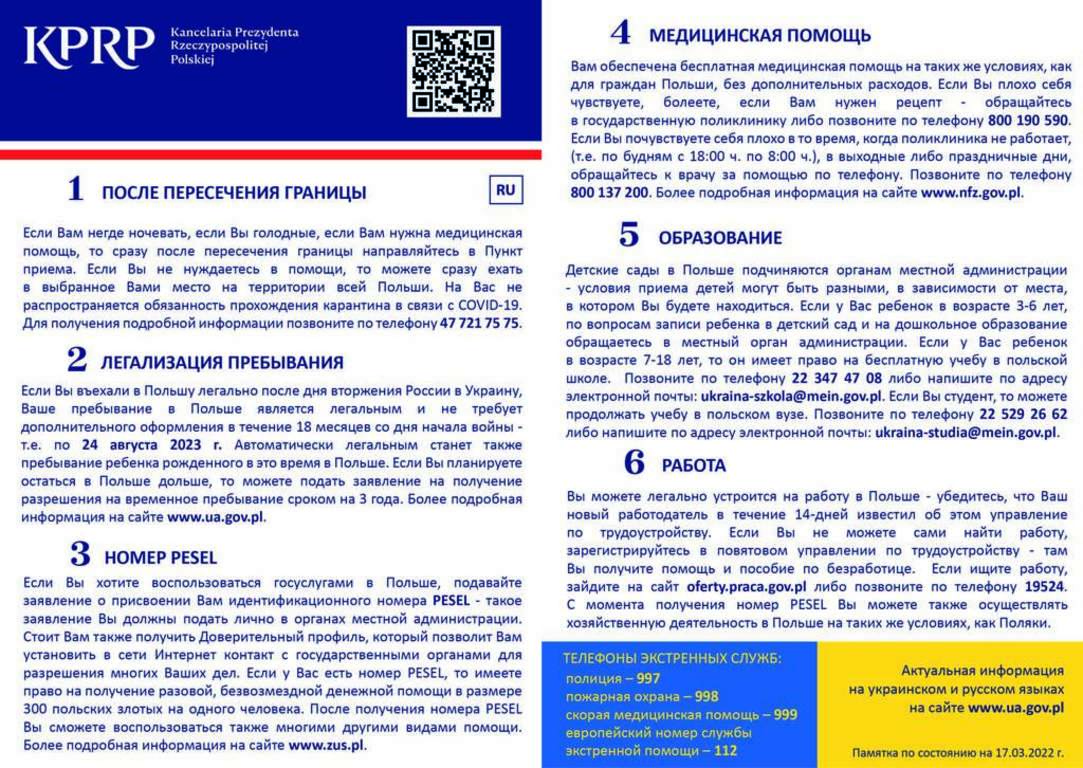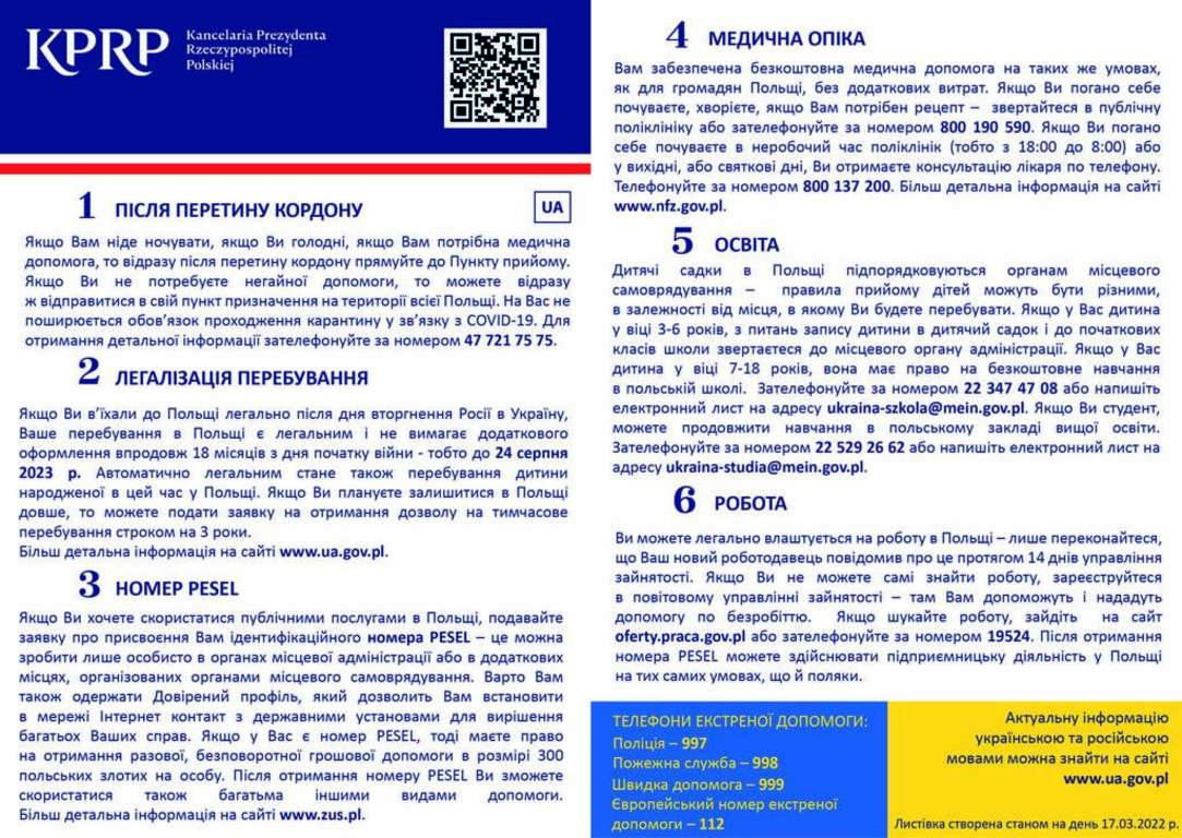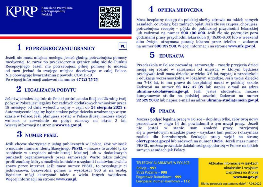 Kancelaria Prezydenta Rzeczypospolitej Polskiej opracowała ulotkę informacyjną dla uchodźców z Ukrainy, dostepną pod adresem: www.prezydent.pl