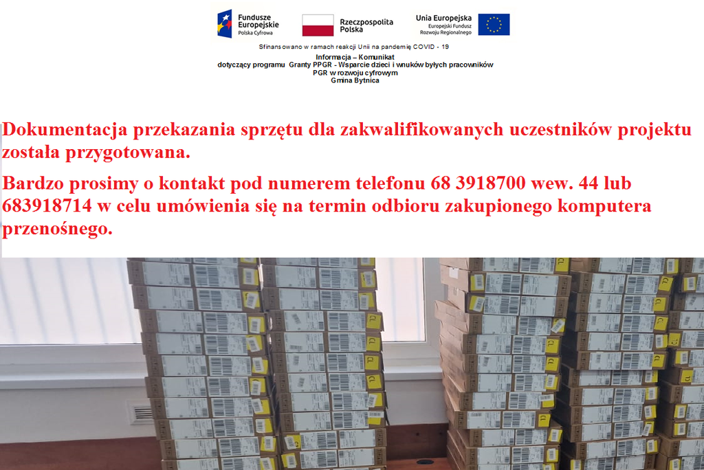Bardzo prosimy o kontakt pod numerem telefonu 68 3918700 wew. 44 lub 683918714 w celu umówienia się na termin odbioru zakupionego komputera przenośnego.