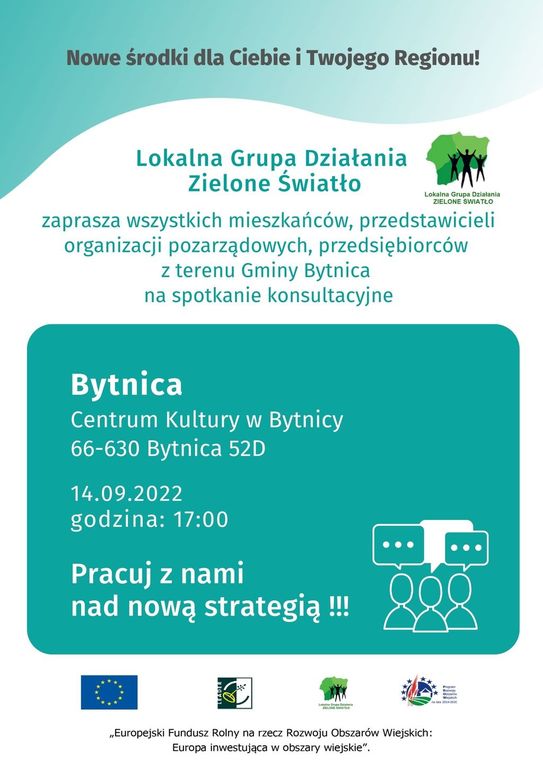 Zapraszamy Mieszkańców gminy Bytnica na spotkanie konsultacyjne przygotowania Lokalnej Strategii Rozwoju na nowy okres finansowania 2021-2027, które odbędzie się dnia 14 września 2022 r. o godz. 17:00 w Centrum Kultury w Bytnicy.