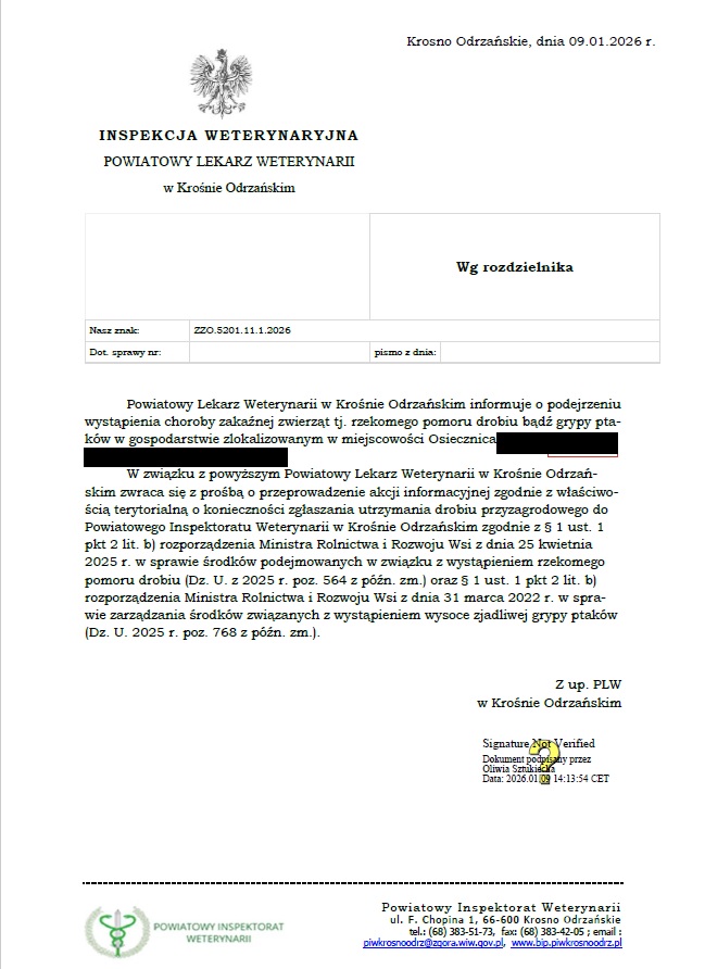W związku z powyższym Powiatowy Lekarz Weterynarii w Krośnie Odrzańskim zwraca się z prośbą o przeprowadzenie akcji informacyjnej zgodnie z właściwością terytorialną o konieczności zgłaszania utrzymania drobiu przyzagrodowego do Powiatowego Inspektoratu Weterynarii w Krośnie Odrzańskim zgodnie z § 1 ust. 1 pkt 2 lit. b) rozporządzenia Ministra Rolnictwa i Rozwoju Wsi z dnia 25 kwietnia 2025 r. w sprawie środków podejmowanych w związku z wystąpieniem rzekomego pomoru drobiu (Dz. U. z 2025 r. poz. 564 z późn. zm.) oraz § 1 ust. 1 pkt 2 lit. b) rozporządzenia Ministra Rolnictwa i Rozwoju Wsi z dnia 31 marca 2022 r. w sprawie zarządzania środków związanych z wystąpieniem wysoce zjadliwej grypy ptaków (Dz. U. 2025 r. poz. 768 z późn. zm.).